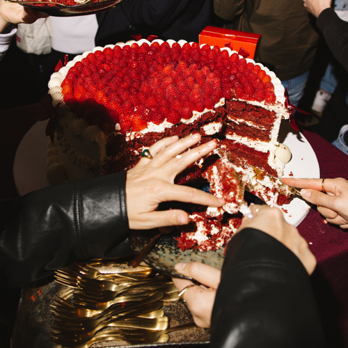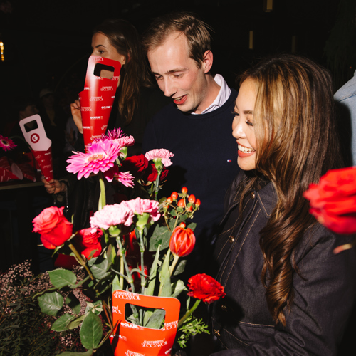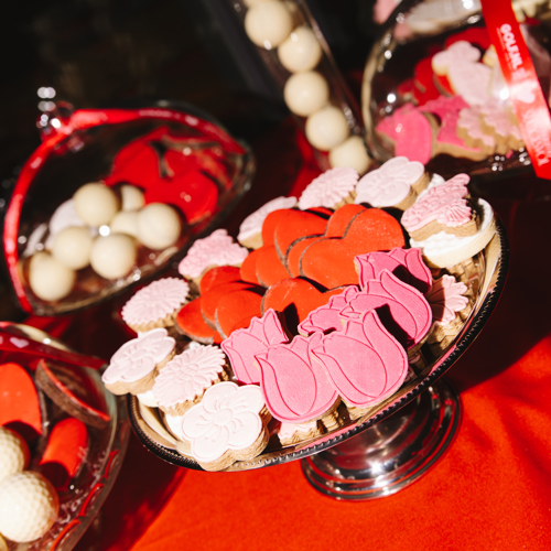 Na het sportieve gedeelte werd de avond moeiteloos omgetoverd tot een gezellige borrel. De borrel kreeg een zoete upgrade: koekjes, snoep, popcorn. En als absolute blikvanger een reuze red velvet taart, natuurlijk feestelijk aangesneden door Anke en Julia. Nu begon misschien wel het spannendste deel: vrij socializen. Gesprekken verdiepen. Kijken of die klik van eerder nog steeds voelbaar was. En alsof het niet romantisch genoeg was, kon iedereen een eigen Valentijnsboeket samenstellen. Voor jezelf (of voor iemand anders😉).